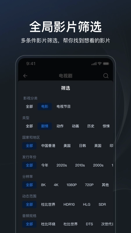 【全局影片筛选】支持依据影片信息设置多个条件来筛选影片;支持在全局范围内搜索片名和演员,助力你迅速找到想要观看的影片。