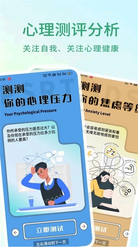 1、自测问卷:用户能够借助各类自测问卷,知晓心理压力的根源与轻重程度,第一时间察觉潜在的问题。