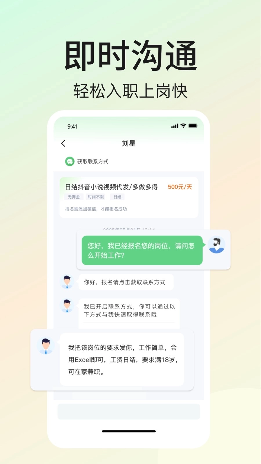 即时通讯功能,可支持文字、语音、视频等多种沟通形式。企业能够发送岗位详情与工作要求,求职者则可以实时咨询薪资待遇、工作强度等关键信息。