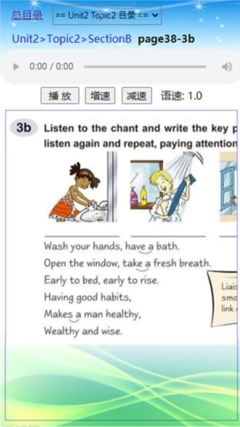 1.课文点读:支持各年级科普版小学英语教材的课文点读,用户可点击句子或单词来开展发音练习。