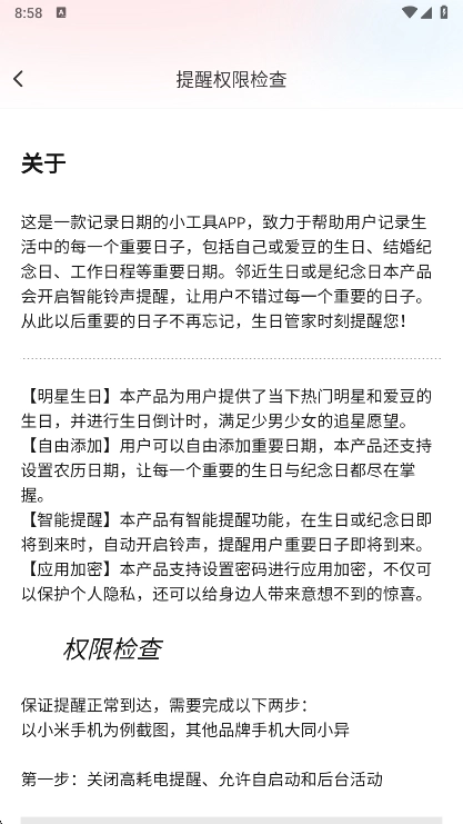 你是不是经常记不住亲友的生日、纪念日,就连偶像的生日也会忘记?生日倒计时管家就是为你量身打造的生日、纪念日提醒小帮手,能帮你守住每一个值得珍惜的日子——比如,他的生日是哪天?你的偶像爱豆什么时候过生日?距离纪念日还有多少天?还要多久才能发工资?哪怕是明星爱豆的生日,它都能智能提醒并显示倒计时,让你再也不用面对“忘记重要日子”的窘迫啦!