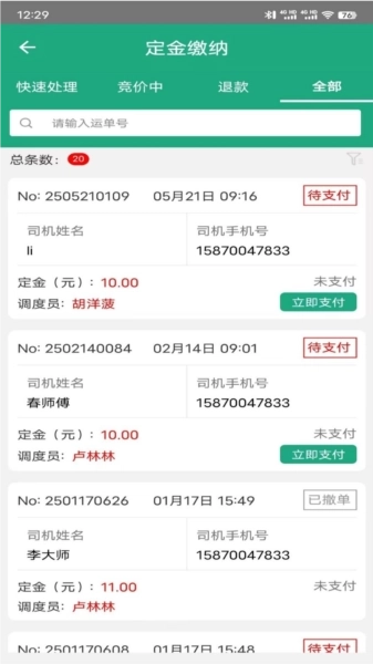通过详细的司机信息,能够全面知晓司机的姓名、手机号码、定金缴纳情况以及对应的调度员等相关内容。
