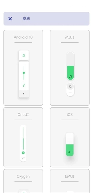 3、若你希望解锁更多音量面板的显示样式,可点击首页的皮肤按钮,切换不同类型的皮肤。这里共有14种音量面板皮肤可供选择,涵盖了Android10原生样式、MIUI、OneUI、EMUI等常见手机系统的音量界面风格。