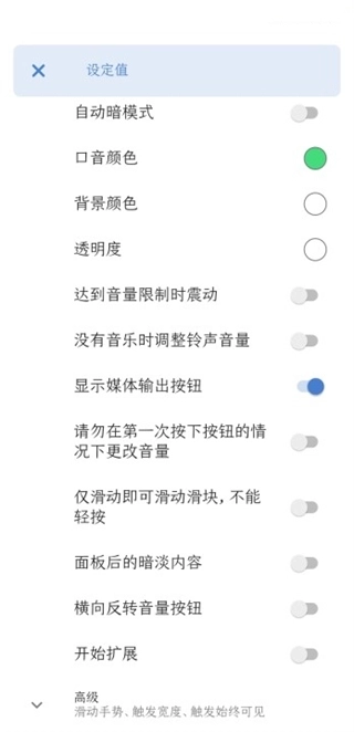 4、要是你对当前音量面板皮肤的颜色等方面不太满意,也可以点击设定值来进行相关设置。