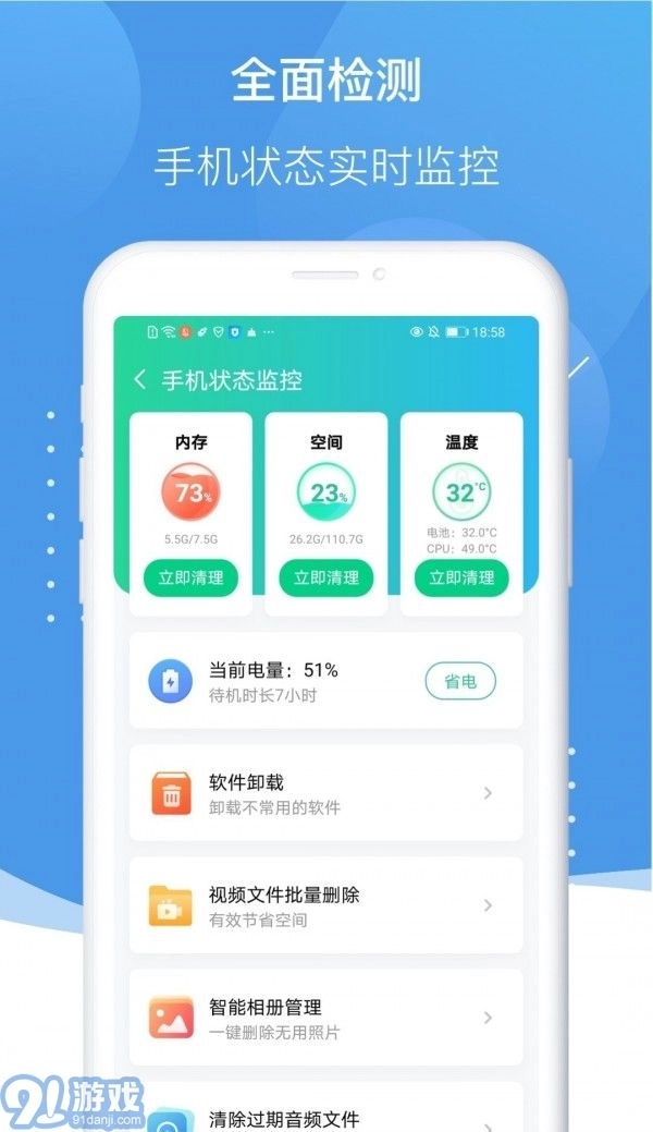 1.全面清理:可对手机内的垃圾文件、缓存数据、无用安装包等进行扫描与清理。