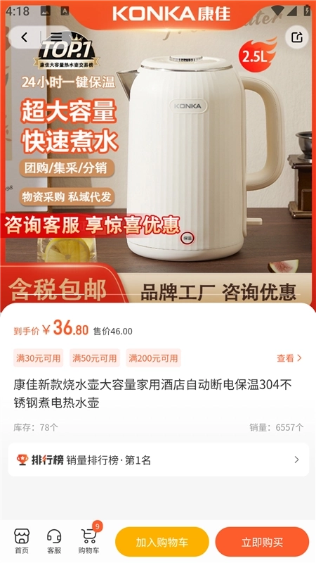 2、浏览商品详情页面,掌握商品相关信息,同时支持收藏、加入购物车以及分享操作