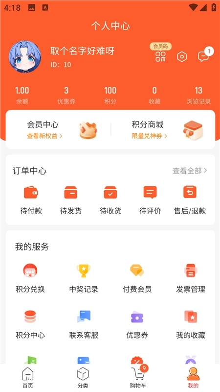 4、在个人中心,即可查看订单、收藏、积分等信息