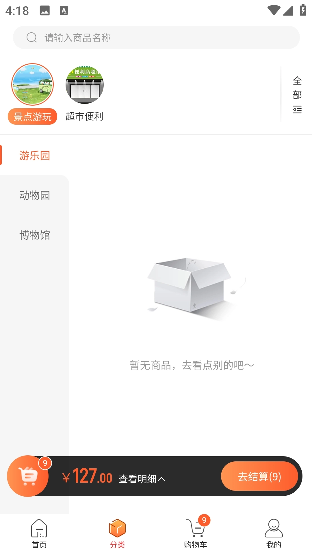3、进入分类板块后,既可以按分类浏览各类商品,也能查看景点游玩相关信息。