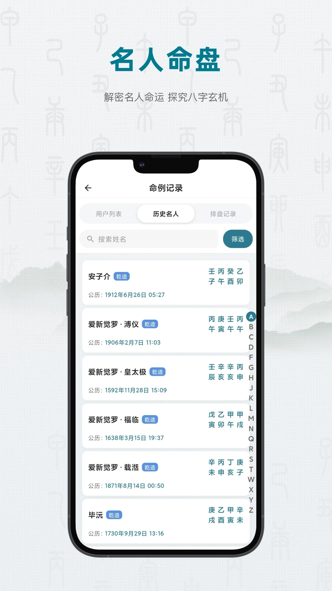 历史名人:在搜索框中输入名字,即可查看其命局特点,此功能适合用于学习与研究。