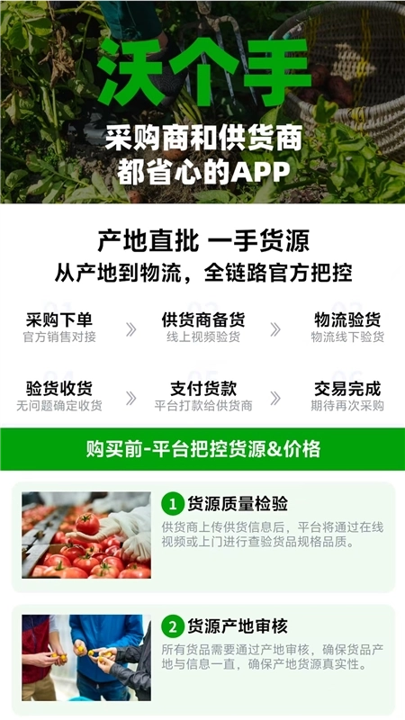 沃个手是一款专注于新鲜水果蔬菜批发采购的电商购物软件。它的核心目标是为用户打造更便捷的进货体验——无需线下奔波,在线即可快速检索所需商品,自主完成下单采购流程,让日常进货变得更省心、更高效。平台汇聚了品类丰富的水果与蔬菜产品,无论是苹果、橙子、香蕉、草莓等各类水果,还是多种蔬菜,都能一站式购齐,全面覆盖用户的日常采购需求。此外,每件商品都配有详尽的信息展示,用户可清晰了解商品参数,方便进行多维度对比后再下单,充分满足不同用户的个性化购物偏好,让采购过程更顺畅。