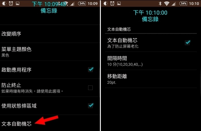 由于开启后信息区块会固定显示在同一位置,建议开启「文本自动位移」功能,使其每隔一段时间自动移动少许距离,这样能有效防止屏幕因长期同一位置显示内容而出现老化现象。