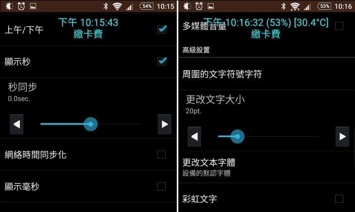 再往下滑动,就能添加毫秒、电池电量和温度信息。此外,还可以调整显示区域的外观风格、文本格式以及布局位置等。