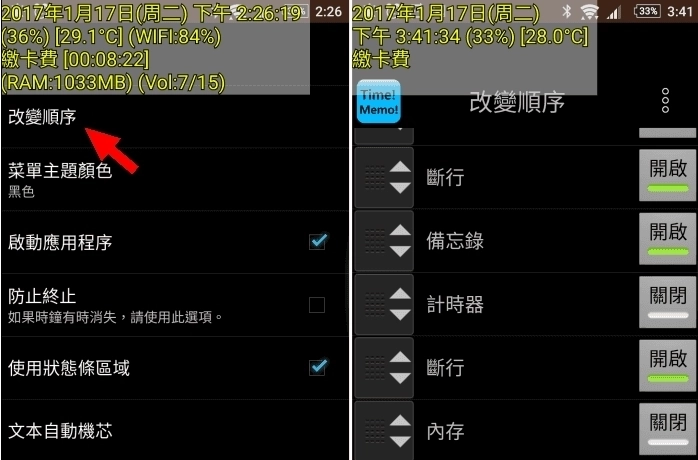 打开大部分功能时,界面会像左图那样显示一长串内容。你可以进入「改变顺序」功能调整各项的位置,也能通过“断行”让信息按照自己喜欢的方式呈现,还能在这里关闭不需要的信息哦!