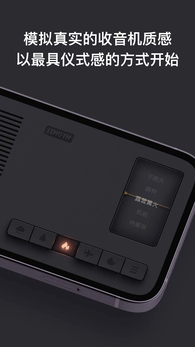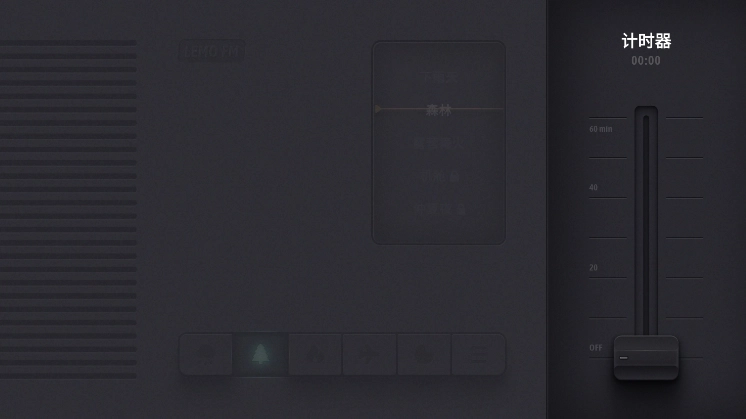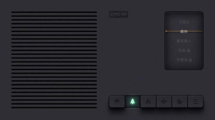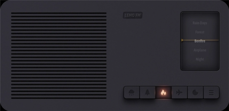 LEMOFM是一款灵感源自收音机的白噪音应用,它的外观设计酷似一台真实的收音机,能够播放下雨、篝火、森林等多种经典且高品质的白噪音。在拟物风格的界面中,点击按钮会产生机械音效与振动反馈,如同按下真实收音机的按键一般。拟物是LEMOFM在视觉层面最显著的特征,而在拟物设计的表象之下,我们所追求的是操作体验的简洁与优雅。