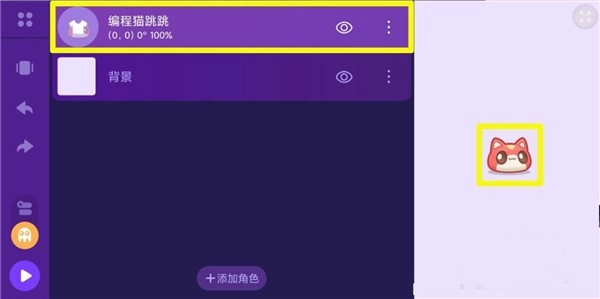 2、点击右侧舞台上的“编程猫跳跳”,或者点击左侧角色列表里的“编程猫跳跳”选项,就能看到角色周围出现一个方框。
