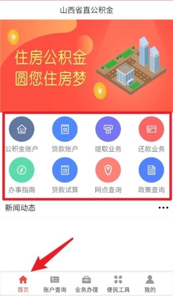 1、在首页能够查看公积金账户、贷款账户,以及提取与还款业务等内容,这里是一站式住房公积金服务的入口。