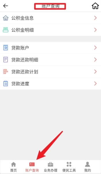 2、点击“账户查询”,即可查看公积金信息、贷款明细、还款计划以及贷款进度等详细的账户内容。