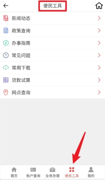 4、“便民工具”板块包含政策查询、办事指南、贷款试算、网点查询等实用信息辅助功能,为用户提供便利支持。