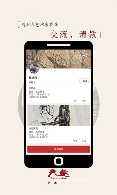 1.艺术家资源丰富:天趣平台汇聚了大量国内外知名艺术家以及高校专家教授,用户能够在软件中通过付费方式与艺术家本人开展一对一的沟通和咨询。