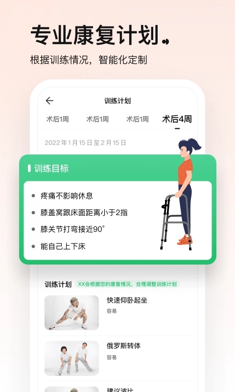 1.专业康复计划:针对用户的手术状况与身体条件,唯医动康可智能化制定专属的康复训练方案。