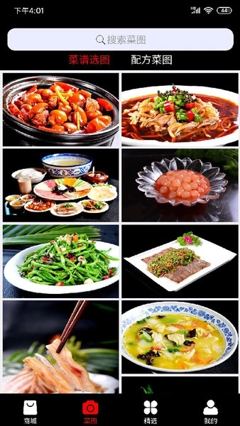 3、菜图分类,将菜图划分为菜谱选图与配方菜图两类,用户可依据自身需求自主挑选。