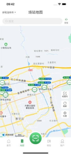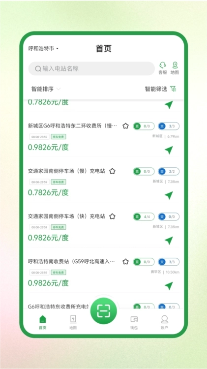 首页地图默认展示周边5公里范围内的充电站,点击图标就能查看桩位状态、电价信息以及用户评价。