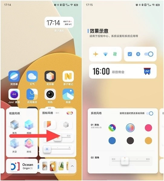 深度系统风格调整功能藏在变形器里,打开变形器后向右滑动就能进入系统风格设置页面。用户可以在这里自由挑选系统的色彩组合,给控制中心、通知栏这类系统界面换上独特的颜色;也能调整系统界面里按钮、卡片等元素的圆角样式,从分明的直角到温润的圆角,都能按照自己的喜好来设置。