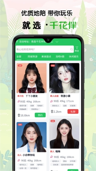 千花伴是一款功能全面的旅游陪玩应用,平台汇聚了大量专业陪玩用户,用户可自主搜索附近的陪玩伙伴,支持一键线上预约,轻松享受贴心又愉悦的旅行服务。陪玩类型十分丰富,无论是旅游出行、美食探店还是休闲娱乐等场景,都能找到专业的陪玩搭档,充分满足个性化的娱乐需求。此外,应用会不定期推送各类活动,用户可实时关注活动动态,便捷预约玩伴,让生活更添乐趣;陪玩订单详情清晰展示,用户能随时查看服务进度,及时获取服务体验,感受安心又舒心的生活服务。