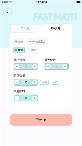 自定义模式包含闪算与珠心算两大功能模块。闪算功能采用看心算的训练形式,用户可自主设置计算方法、数字范围、题目笔数以及题目间的时间间隔;珠心算功能则支持用户自定义计算方法、题目数量和单题用时,借助大量且反复的练习,能够有效提升使用者的数学运算能力与心算水平。