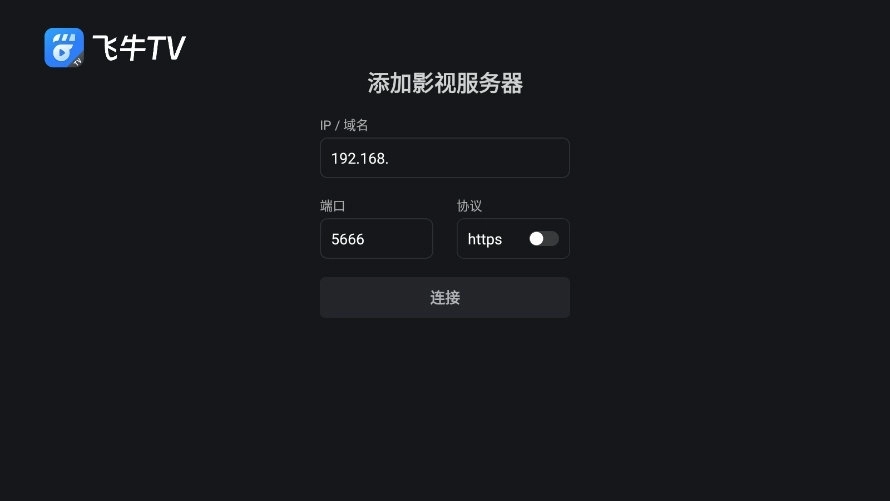 在飞牛影视TV版中手动添加服务器的方式是:手动输入影视服务器的IP地址或者DDNS域名。