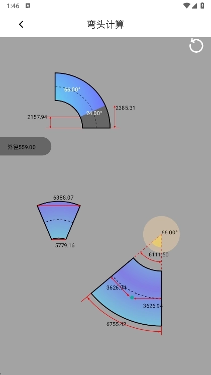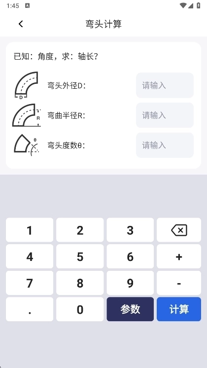 弯头计算的操作步骤如下:先点击底部的【计算】按钮,接着在选项中选择“弯头计算”,然后输入“角度”这一参数,最后再次点击计算,系统便会自动得出轴长的结果。
