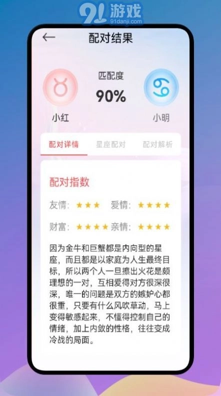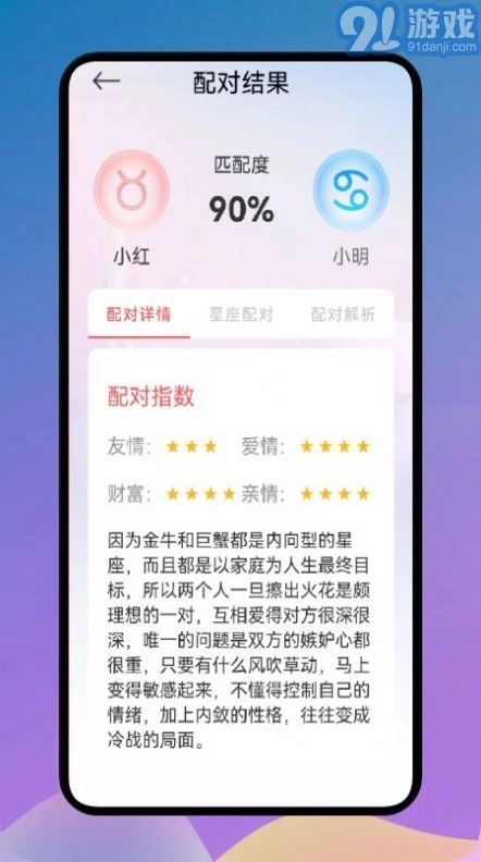 3.星座配对:用户输入两人的星座信息后,系统会分析他们的相容性及可能的相处模式,进而为用户提供爱情方面的建议与指导。