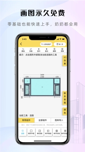 1、免费创作工具:易绘门窗配备了多款可免费使用的绘图工具,能协助用户更轻松地完成高质量的门窗设计方案绘制。