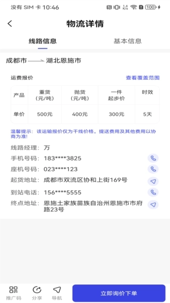 贴心服务:提供物流信息分享功能与一键通话服务,助力简化沟通环节,提升服务响应速度与效率。