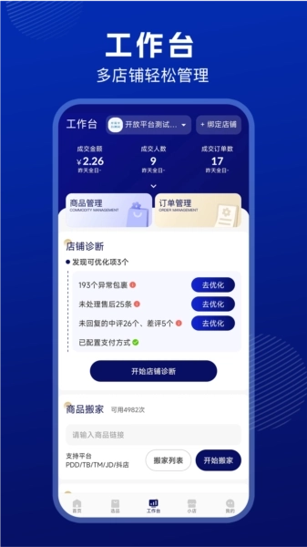 多商家管理:支持商家绑定并运营管理多个店铺,助力提升店铺整体运营能力。