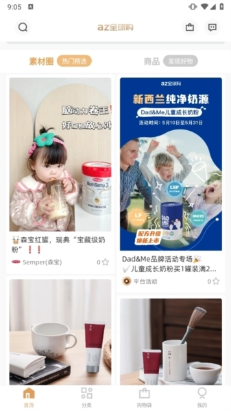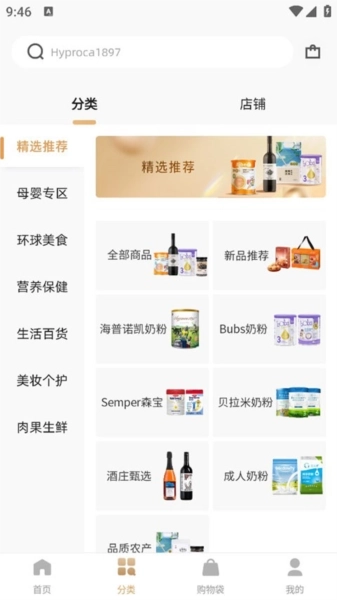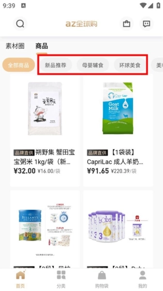 1、在首页挑选商品时,可依据自身需求选择商品类型,像新品推荐、环球美食、母婴辅食等都可供选择。