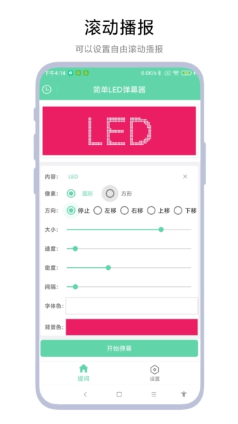 简单LED弹幕器是一款功能丰富、操作简便的LED弹幕工具应用。无论是在演唱会、约会还是生日派对等各种场合,都能展现出引人注目的弹幕效果。用户可以通过软件自由设置弹幕内容和颜色,快速制作出个性化的弹幕展示,提升活动氛围。感兴趣的可以来试一试。