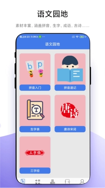 提供了《拼音入门》《汉字入门》《唐诗宋词》等多个学习场景。