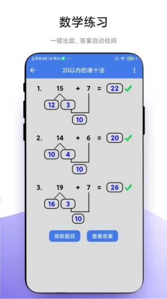 提供了多个数学计算场景,每个场景有多个难度可以选择,一键刷新题目,一键自动检阅答案;