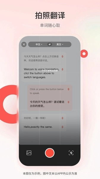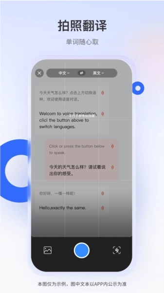 2、便捷拍照功能:只需一键拍摄,即可快速识别文字,轻松应对生活里的翻译问题,像外文书籍、标识之类的场景都能搞定。