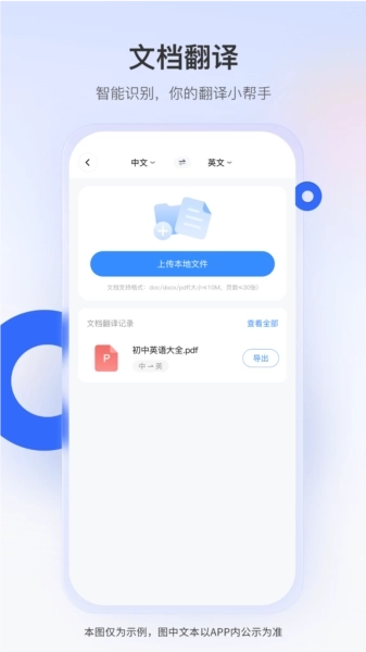4、精准文档服务:针对合同、报告等专业文件,提供高效且精准的翻译支持,为您的工作推进助力。