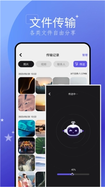连接成功后,在发送手机上挑选好需要传送的文件,点击“传送”按钮就能启动传输。传输期间,能够实时查看传输的进度和状态。