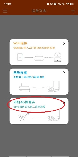 接下来点击第三个“添加4G摄像头”选项,扫描摄像头机身上的二维码以完成连接操作。