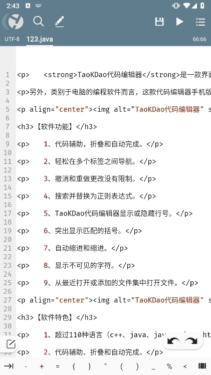 另外,相较于电脑端的编程软件,这款代码编辑器手机版具备得天独厚的优势。首先,电脑版编程软件往往较为笨重,且电脑便携性差是众所周知的问题,而手机版代码编辑器则能完美解决这一痛点——用户在急需编写代码时,可通过它轻松完成创作,进而更便捷地分享给好友或应用于工作场景,大幅提升工作效率。简而言之,无论是其简单易上手的操作逻辑,还是强大实用的功能配置,这款软件都堪称编程人员人手必备的“福音工具”。