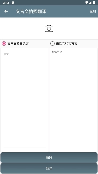 首先选定翻译模式,接着点击相机图标完成拍照,您也能够导入手机里的图片,系统会自动识别其中的文本内容并开展翻译。