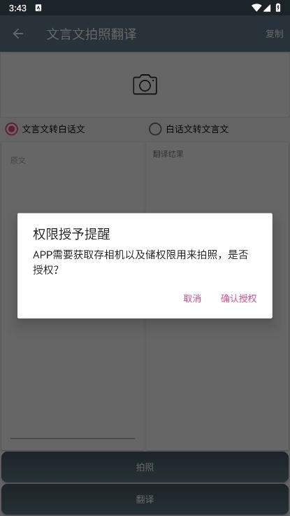首次使用本应用时,需要开启两个必要权限:一是“存储权限”,用于保存您的翻译记录;二是“相机权限”,以便实现拍照翻译功能。如果您之前拒绝了这些权限,可以通过以下路径手动开启:进入系统设置,依次找到“应用管理”→“文言文翻译助手”→“权限”,在权限页面中开启对应的权限即可。