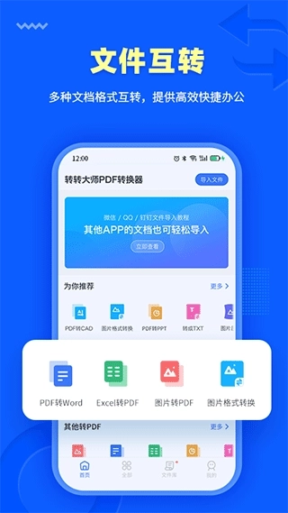 转转大师PDF转换器是一款适用于移动办公场景的文档转换工具,具备丰富的文件格式转换能力,涵盖PDF与Word、PPT、Excel、图片、CAD等格式的互转,以及TXT转PDF等功能;同时提供PDF分割合并、压缩、密码解除等实用处理工具。软件操作界面简洁直观,让日常文档转换处理变得轻松高效。它支持从QQ、微信、钉钉等社交及办公软件中直接导入文件,还能一次性选择多个文件进行批量格式转换,大幅简化操作流程、节省时间成本,有效提升用户的工作效率,欢迎有需要的用户体验使用。