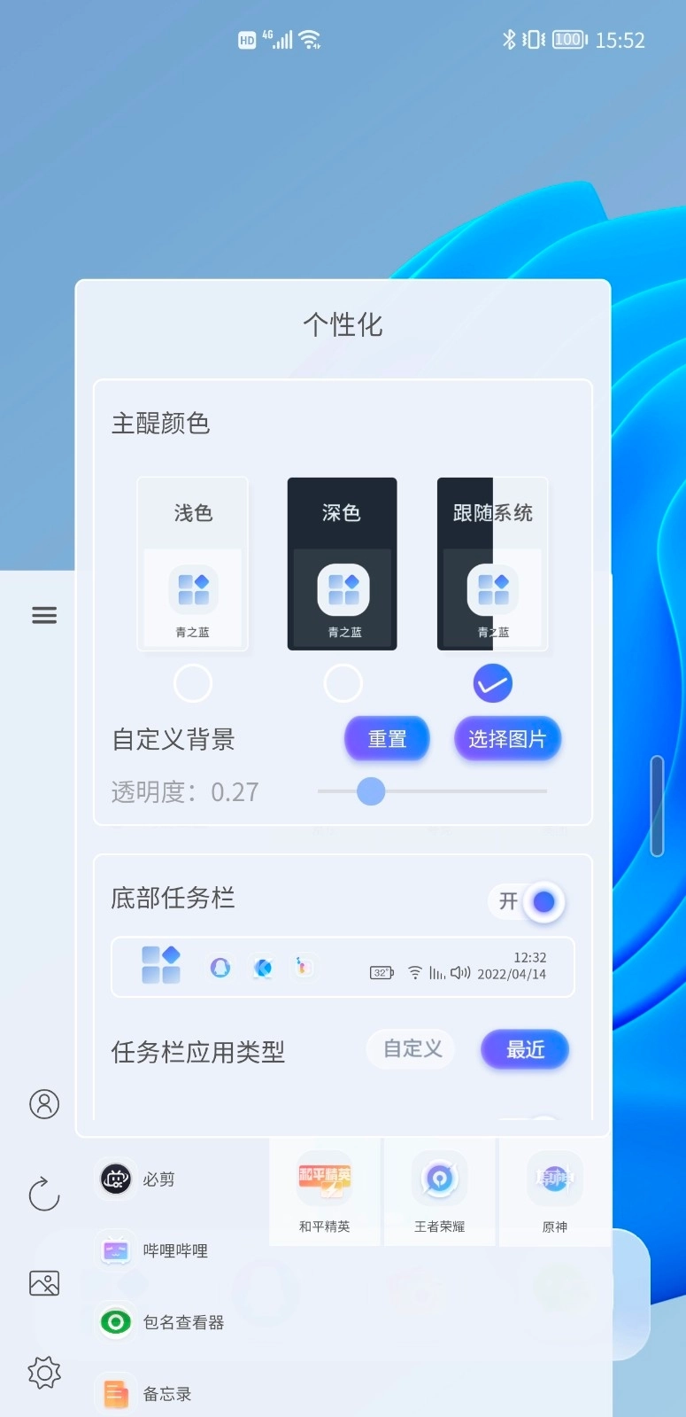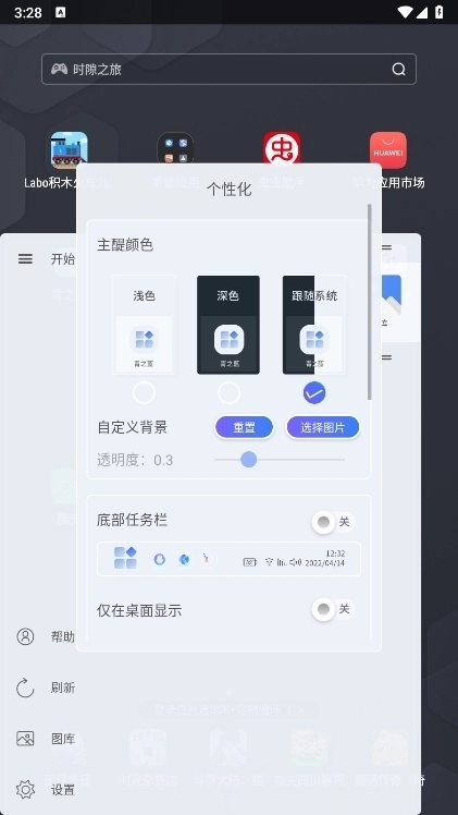 底部任务栏:在“个性化”页面打开底部任务栏的开关,即可快速调出设置菜单。