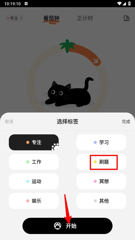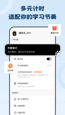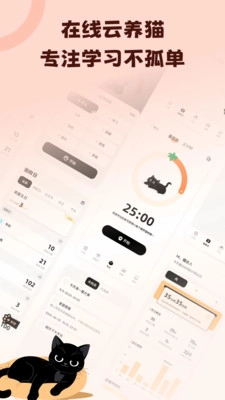 1、支持设置多种专注时长,结合萌趣的猫咪进食动画,每完成一个专注周期就会自动投喂猫粮。