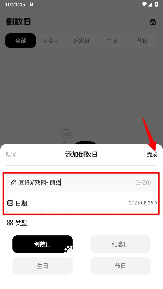 3、接着为倒数日命名、选定日期,之后点击“完成”按钮。